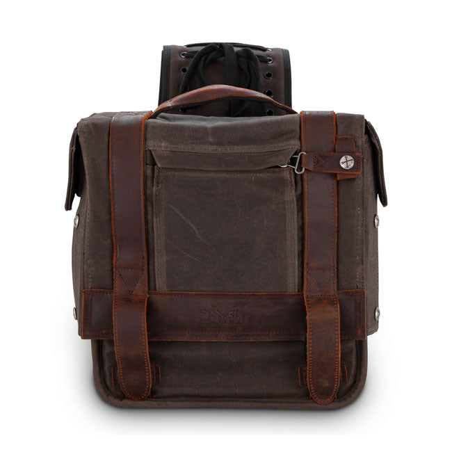 Uniwersalny zestaw toreb motocyklowych Burly jest dostępny w kolorze czarnym Cordura lub ciemnym dębie z woskowanego płótna, które są trwałe i zyskują charakter wraz z upływem czasu. Skórzane wykończenia nadają im styl vintage, a wzmocniona metalowa i polietylenowa rama wewnętrzna zapewnia, że torby zachowują swój kształt niezależnie od tego, czy są pełne, czy puste. Szerokość można regulować, aby dopasować torby do różnych rozmiarów błotników, a zamknięcie typu roll-top z systemem Snap/Velcro Road Shield chroni przed wiatrem i warunkami atmosferycznymi.