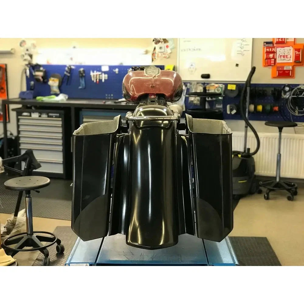 Ten zestaw sakw i błotników zmienia wygląd motocykla dzięki wydłużeniu o 5 cali w dół i 7 cali w bok. Sakwy są bezpośrednim zamiennikiem standardowych toreb, oferując dodatkowe miejsce do przechowywania przy ponownym wykorzystaniu istniejących elementów mocujących i pokryw. Zarówno torby, jak i błotniki są wstępnie nawiercone, co ułatwia montaż, i wykonane z ręcznie układanego, pokrytego czarną powłoką żelową włókna szklanego, które zapewnia wytrzymałość, sztywność i lekkość.