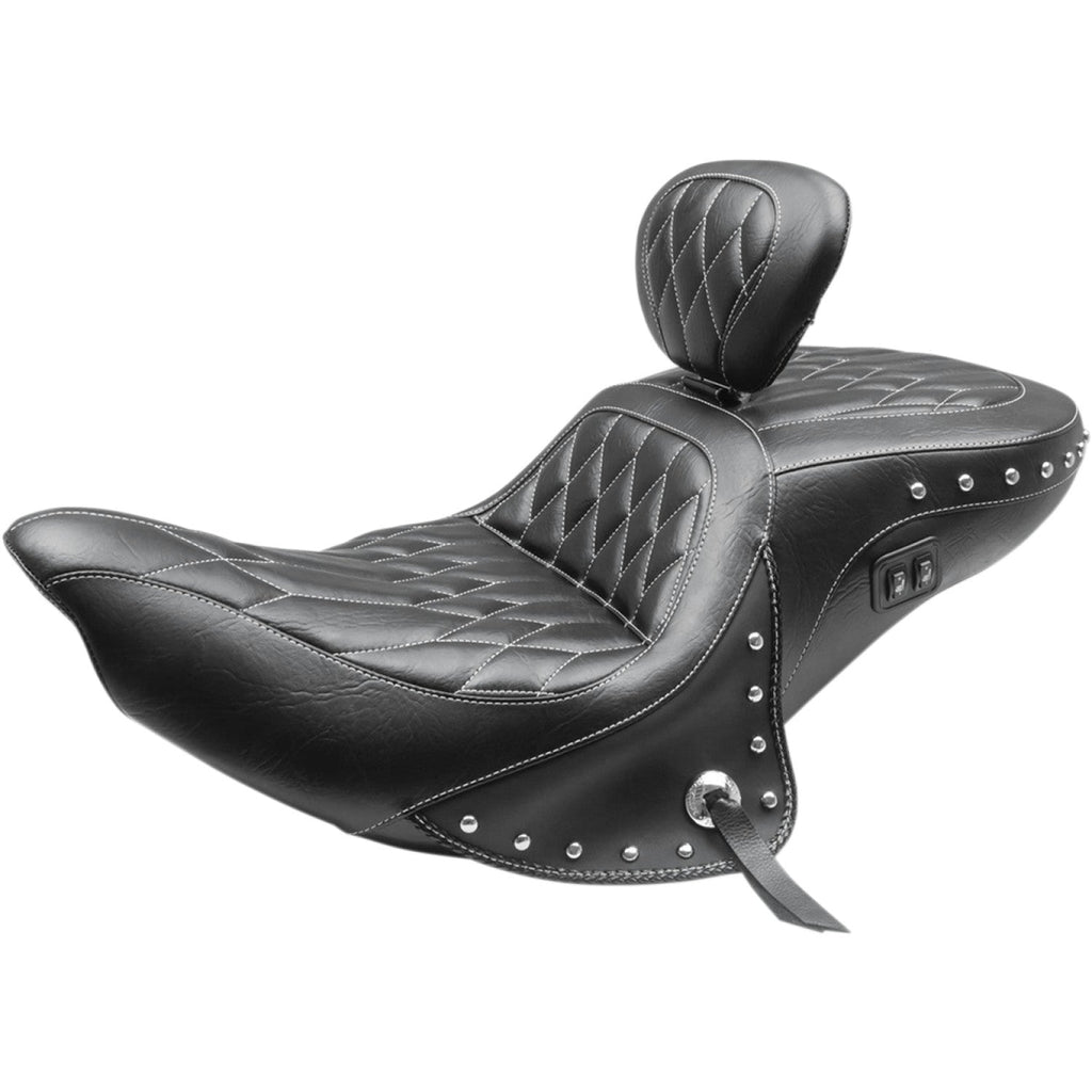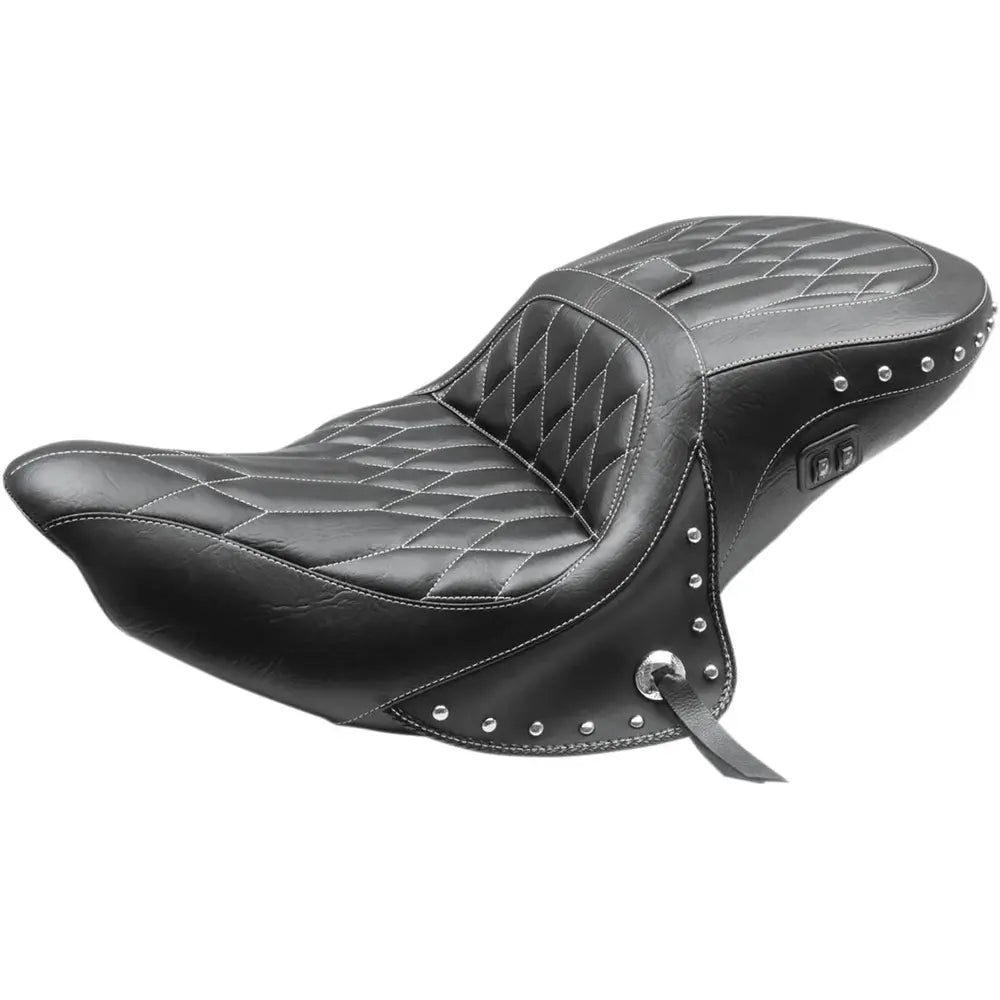 Podgrzewany Standard Touring 2-Up od Mustang zmienia Indian Roadmaster w prawdziwą maszynę do długich dystansów. Kierowca siedzi nieco niżej i dalej niż w przypadku standardowego siedzenia, co zapewnia wygodę i relaks podczas jazdy. Wbudowany dwustrefowy system ogrzewania pozwala kierowcy i pasażerowi indywidualnie regulować poziom ogrzewania za pomocą dyskretnych elementów sterujących ukrytych pod pokrowcem z rombowym przeszyciem. Dołączone oparcie jest regulowane, zdejmowane i można je złożyć, gdy nie jest używane. Trwałe, wygodne i dobrze zaprojektowane siedzenie stworzone z myślą o wielu kilometrach na drodze.