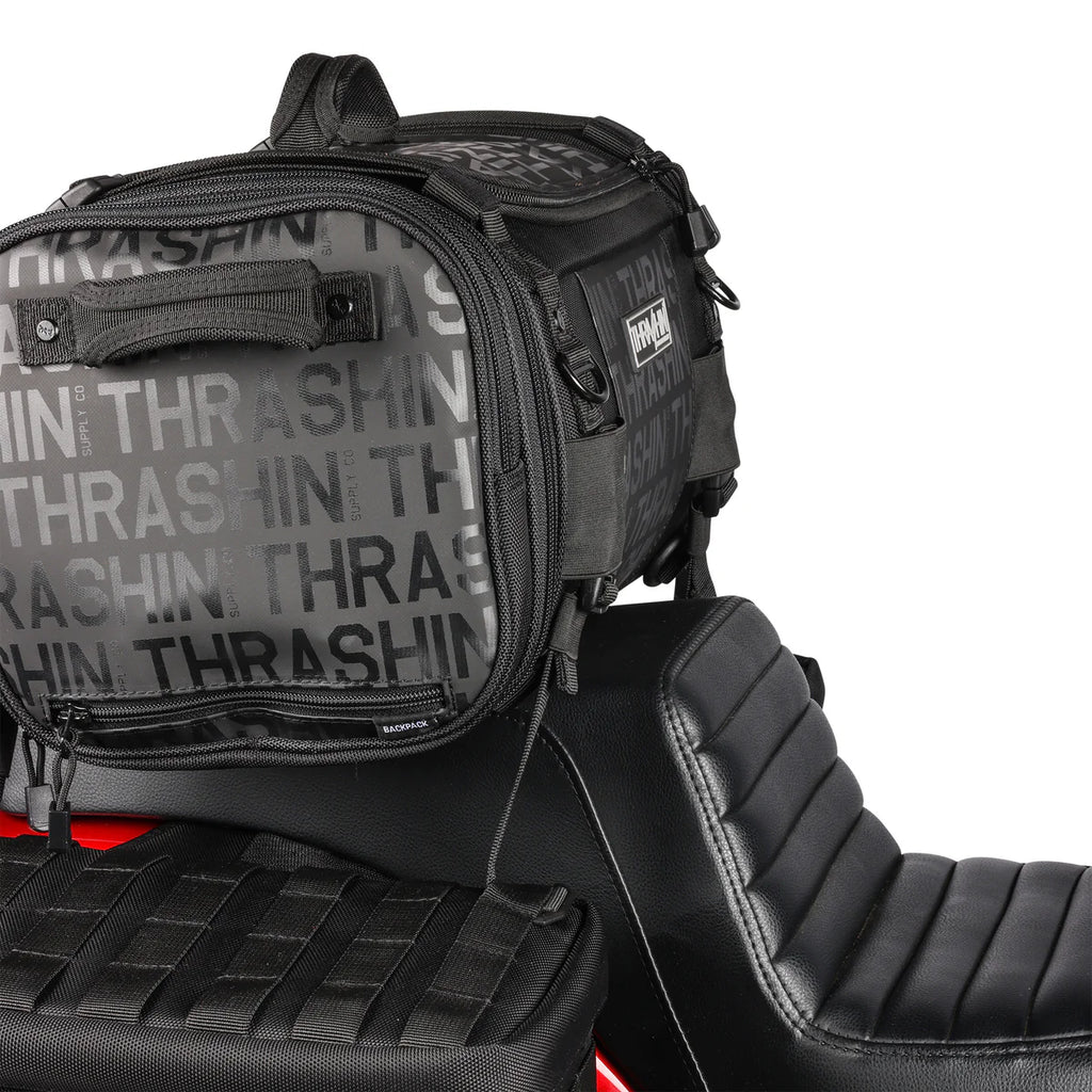 Ten zestaw pasków ułatwia zamocowanie dodatkowego wyposażenia do zestawu Thrashin. Plastikowe zatrzaski przechodzą przez taśmy MOLLE, zapewniając bezpieczne mocowanie, a przeciwległe klamry z bocznym zwalnianiem umożliwiają bezpośrednie zamocowanie torby pasażera bez konieczności stosowania podpórki. Nadaje się również do mocowania innych toreb lub ładunku na górze lub po bokach sakw Thrashin.
