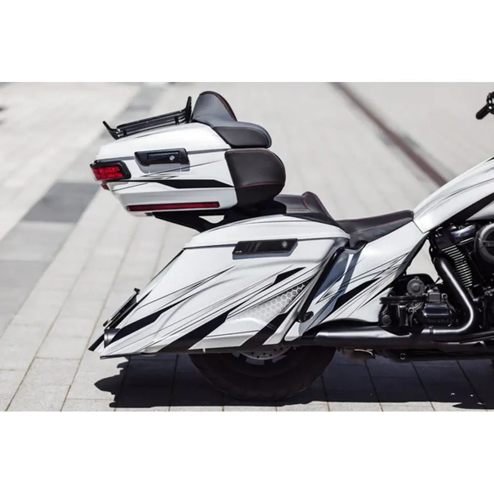 Te rozciągnięte kufry siodłowe z włókna szklanego od Tommy & Sons zostały stworzone dla motocyklistów Harley, którzy poszukują ekstremalnego wyglądu baggera. Precyzyjnie uformowane i rozciągnięte w dolnej części do 7 cali.